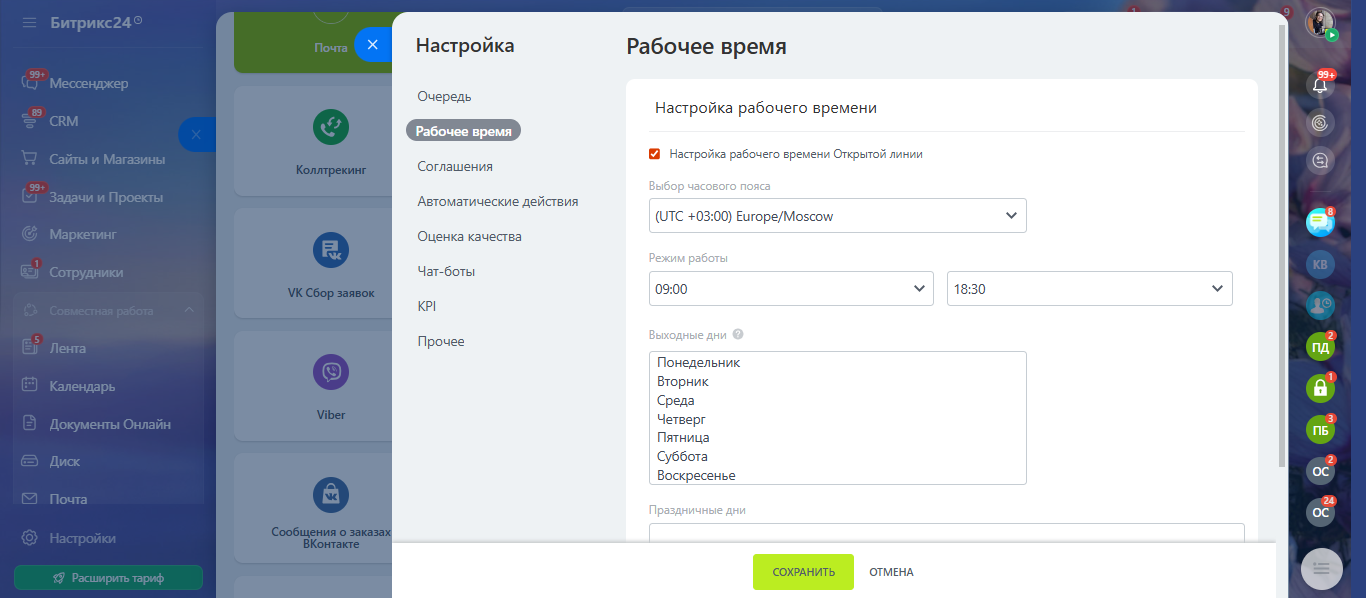 Можно задать расписание работы и настроить автоответы в нерабочее время: например, «Мы сейчас не на месте, ответим в ближайшее время».