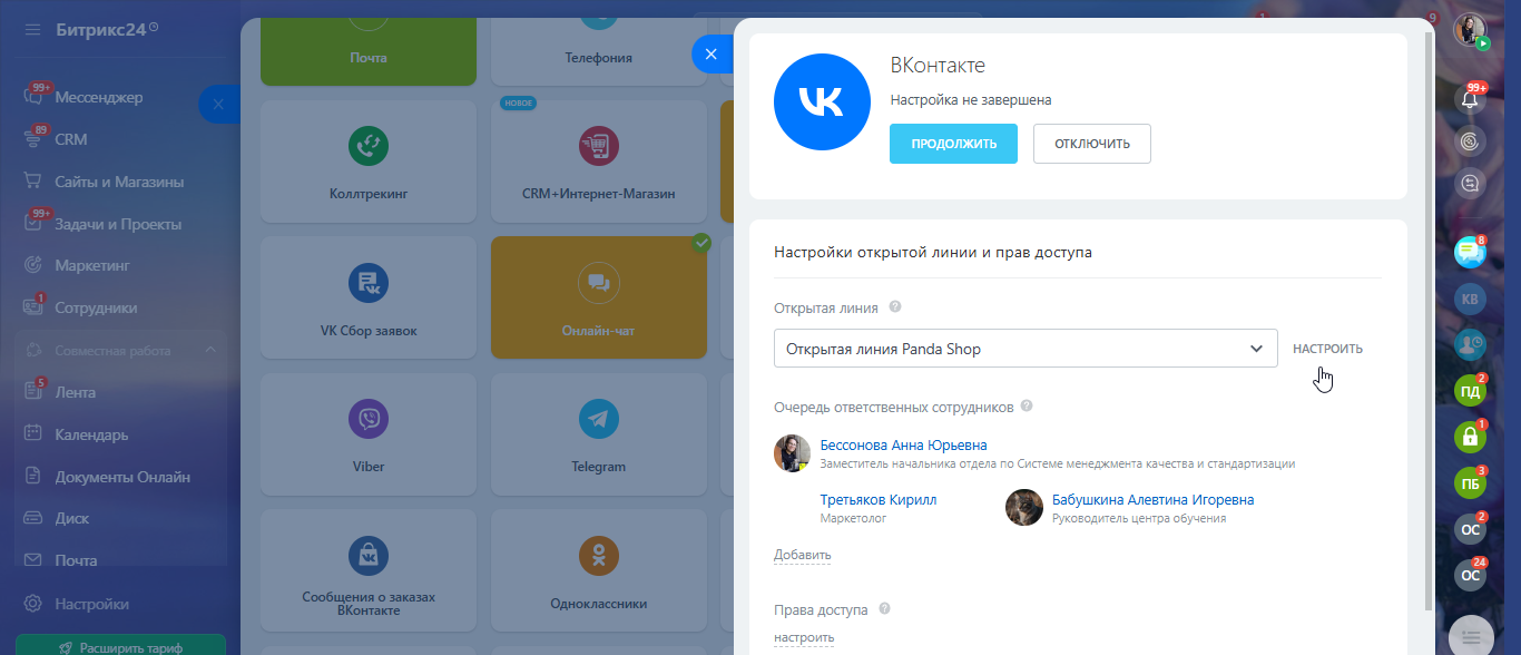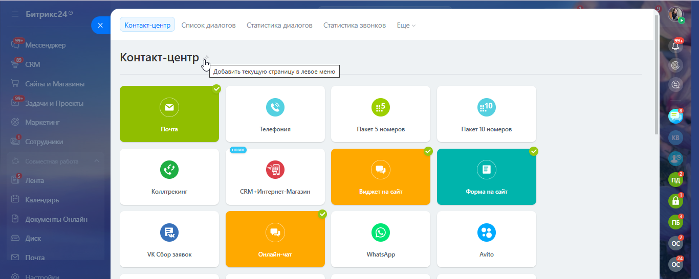 Чтобы создать открытую линию, зайдите в Контакт-центр. Найти его можно через левое меню: CRM > Клиенты > Контакт-центр. А если вы часто пользуетесь этим разделом – его можно закрепить в левом меню, используя иконку скрепки.