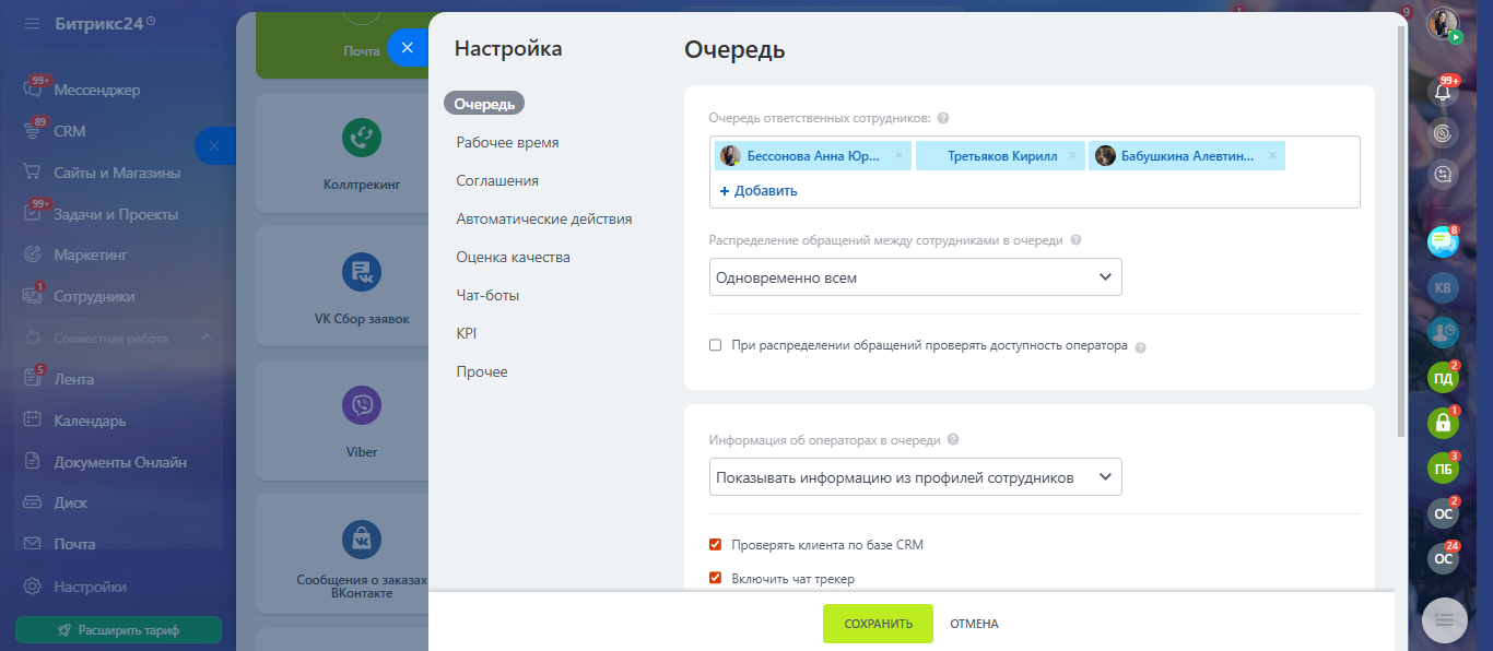 Распределите обращения между сотрудниками: по очереди, равномерно или сразу всем. Можно учесть рабочее время — тогда сообщения будут приходить только тем, кто сейчас на смене. Также можно выбрать, будет ли клиент видеть данные из профилей сотрудников или нет, и что будет происходить, если клиент не найден в CRM (например, создавать лид или сделку).