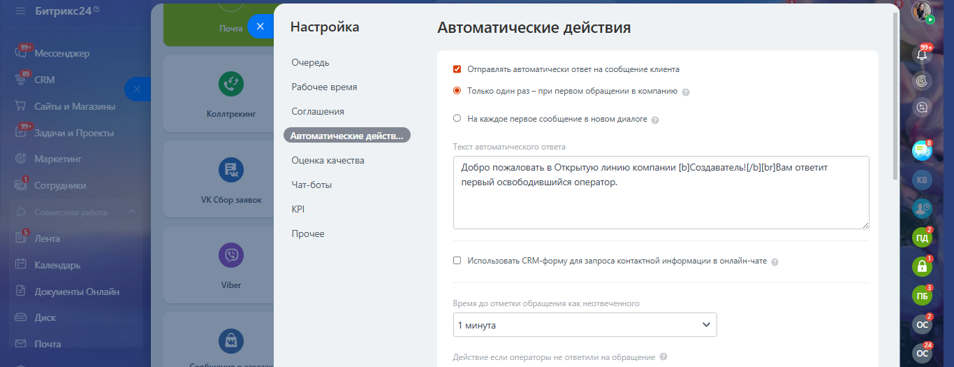В этом разделе настраиваются автоматические ответы клиентам — например, приветственное сообщение при первом обращении или текст, который отправляется, если оператор долго не отвечает. Здесь же можно задать, через сколько времени сообщение будет считаться неотвеченным, и что делать в этом случае. Кроме того, можно создать список быстрых ответов — шаблонов, которые помогут операторам отвечать быстрее и проще.