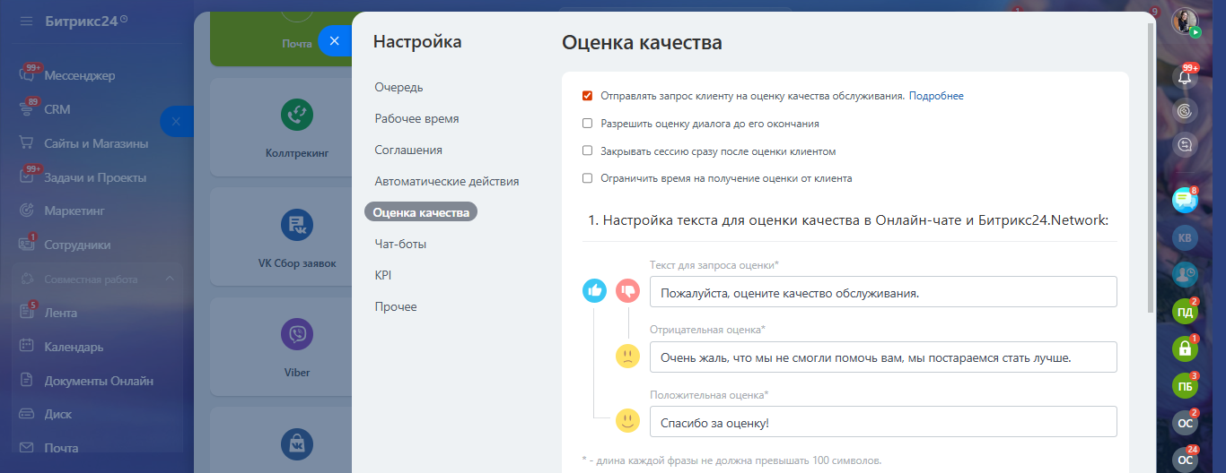 Вы можете отправлять запрос клиенту на оценку качества обслуживания, настраивать текст и условия выставления оценки.