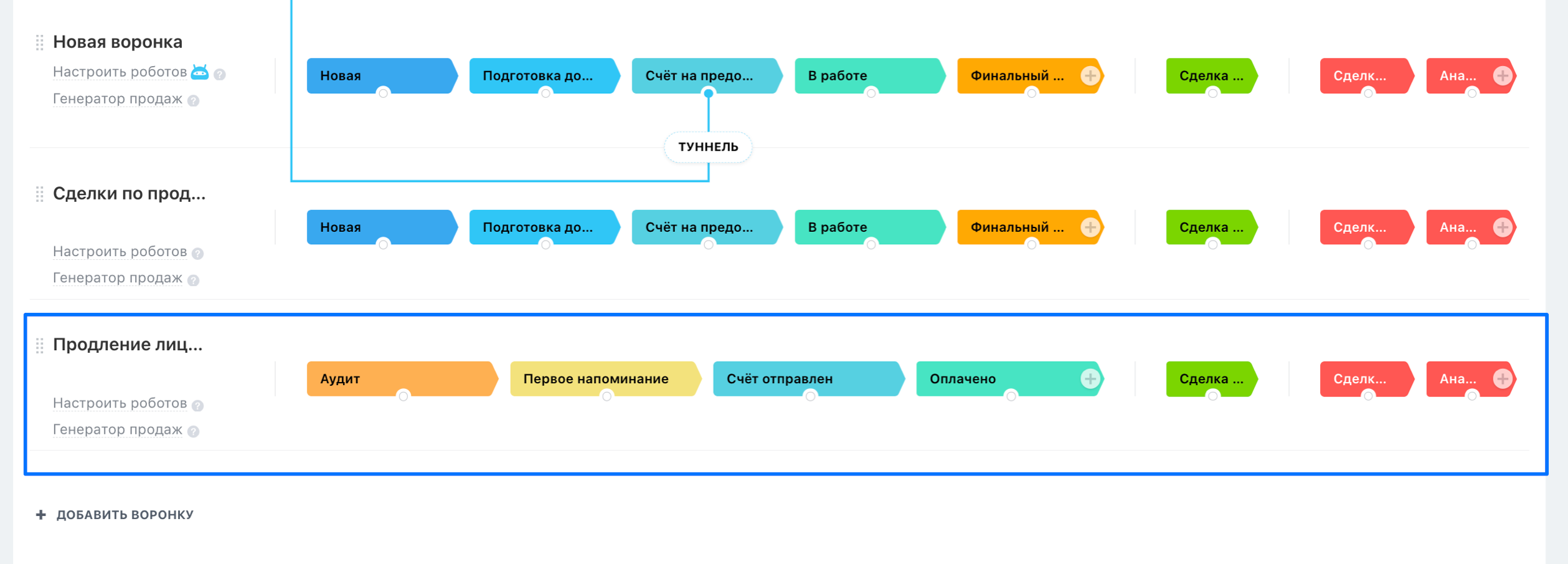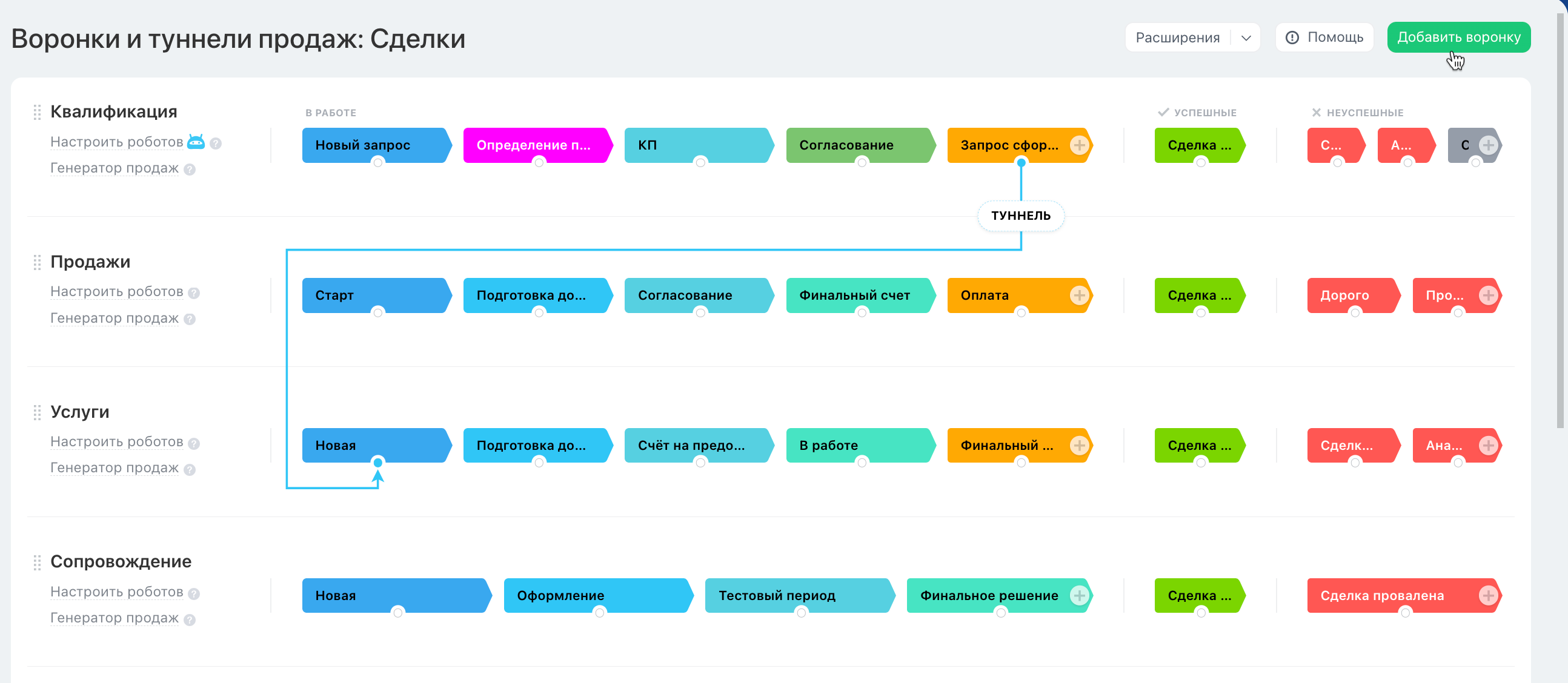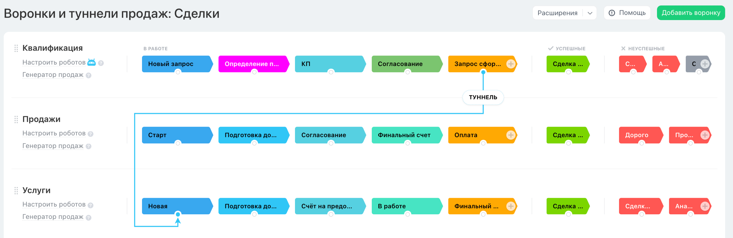 Туннель — это автоматический переход между воронками. Например, если сделка в первичной воронке «Квалификация клиента» дошла до стадии «Запрос сформирован», можно настроить, чтобы она автоматически создавалась в другой воронке — «Услуги» на стадии «Новая». Это удобно, если вы делите работу между отделами или поэтапно сопровождаете клиента.