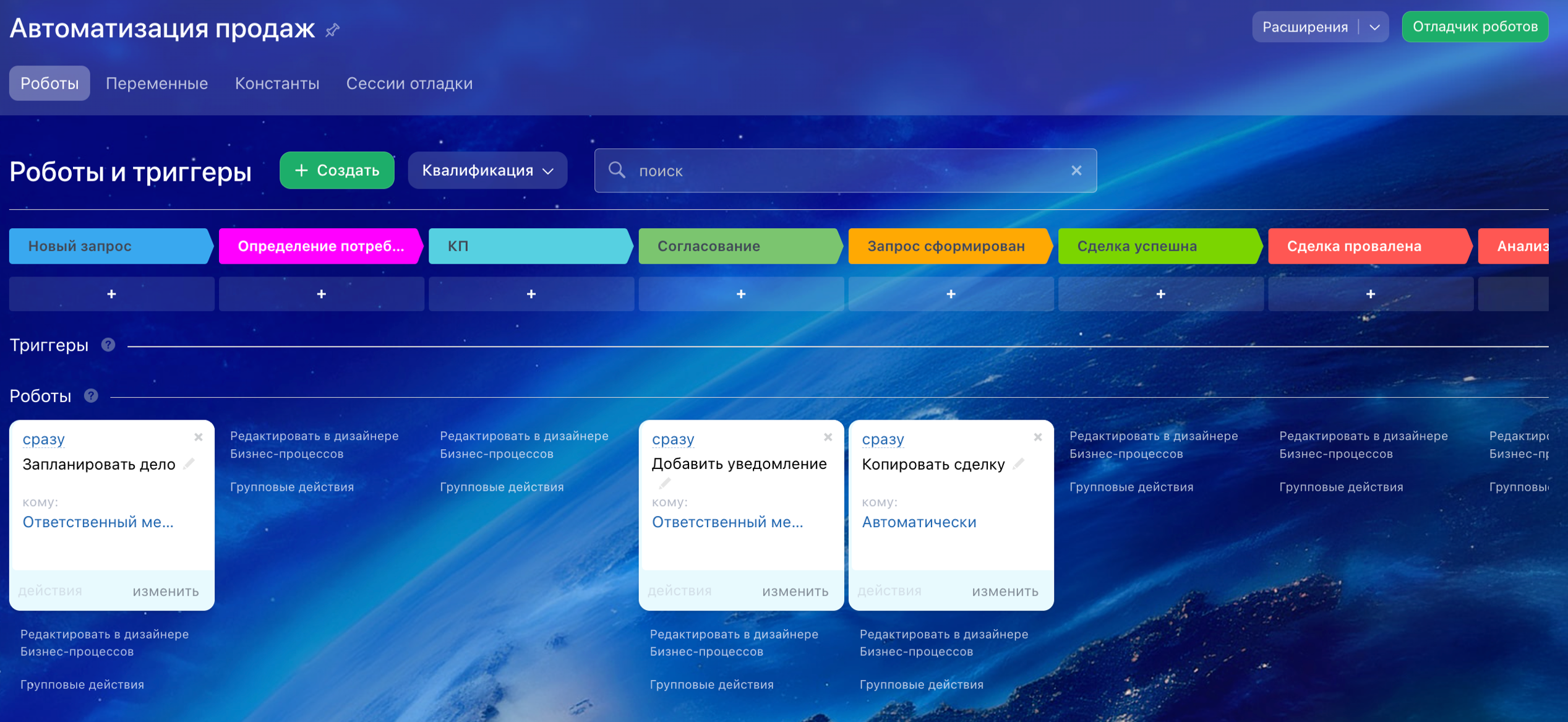- Добавляйте роботов (например, отправка письма, постановка задачи, смена стадии);