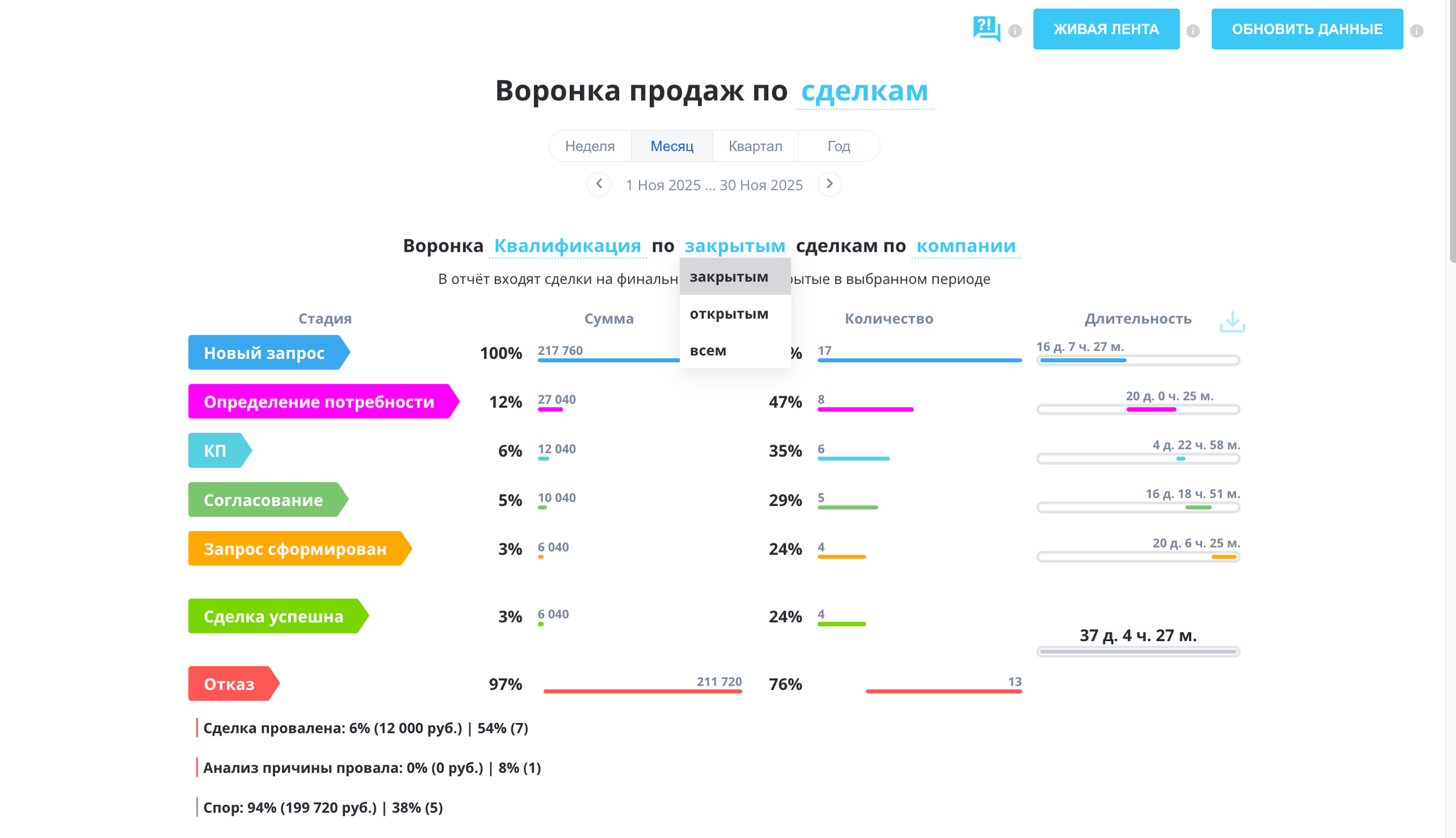 А для того, чтобы отследить конверсию и длительность воронок – используйте решение Воронка продаж. В нем вы сможете получить полноценную картину продаж в одном месте.