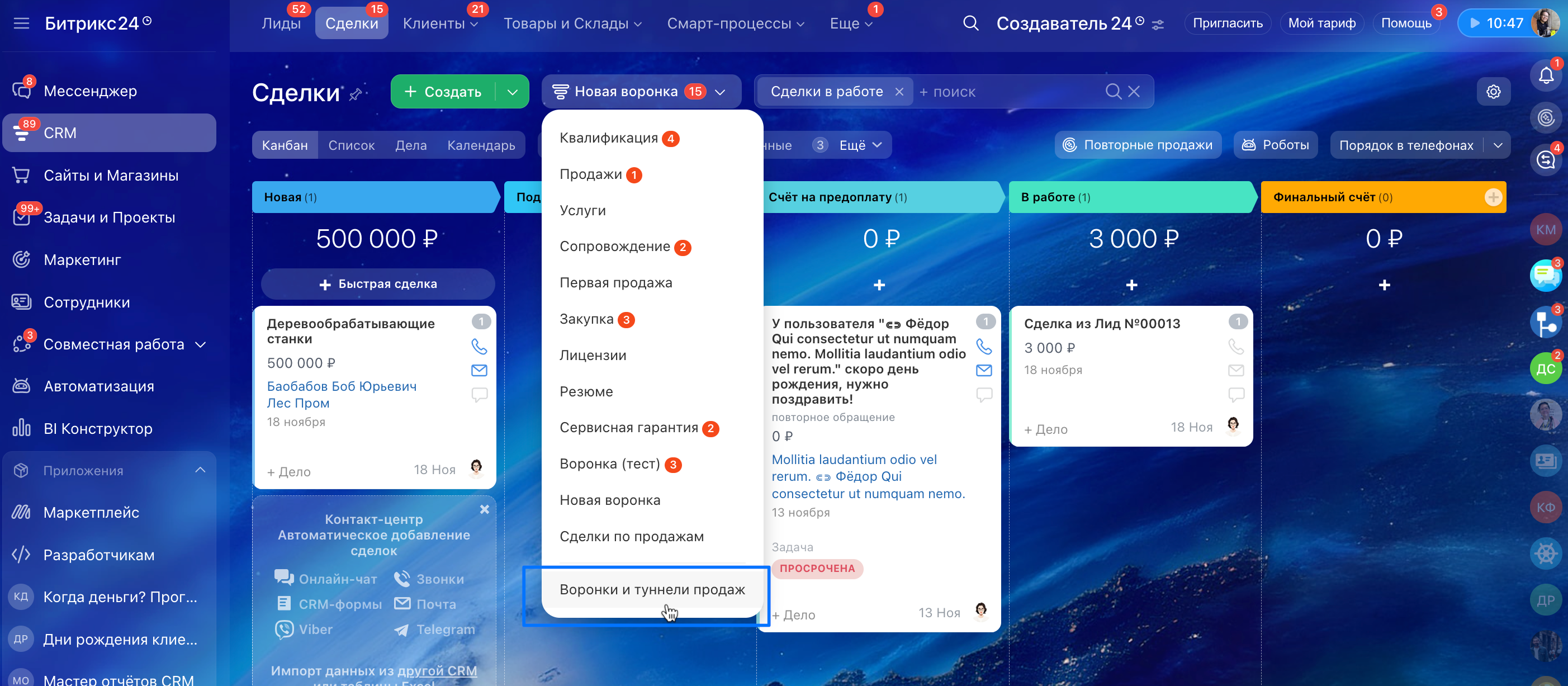 Воронки продаж — один из ключевых инструментов CRM в Битрикс24. С их помощью вы можете выстроить процесс работы с клиентами по шагам, разделять сделки по направлениям и добавлять автоматизацию.