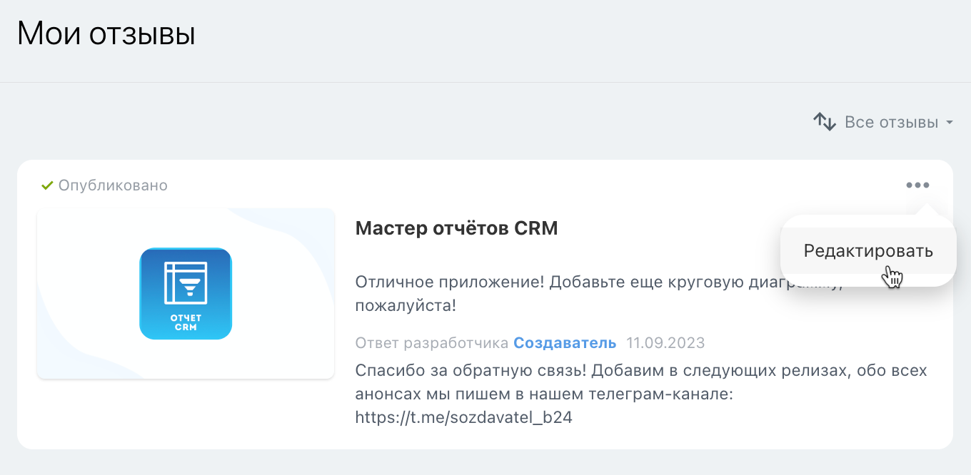 Выберите нужный отзыв, нажмите на три точки и выберите «Редактировать».