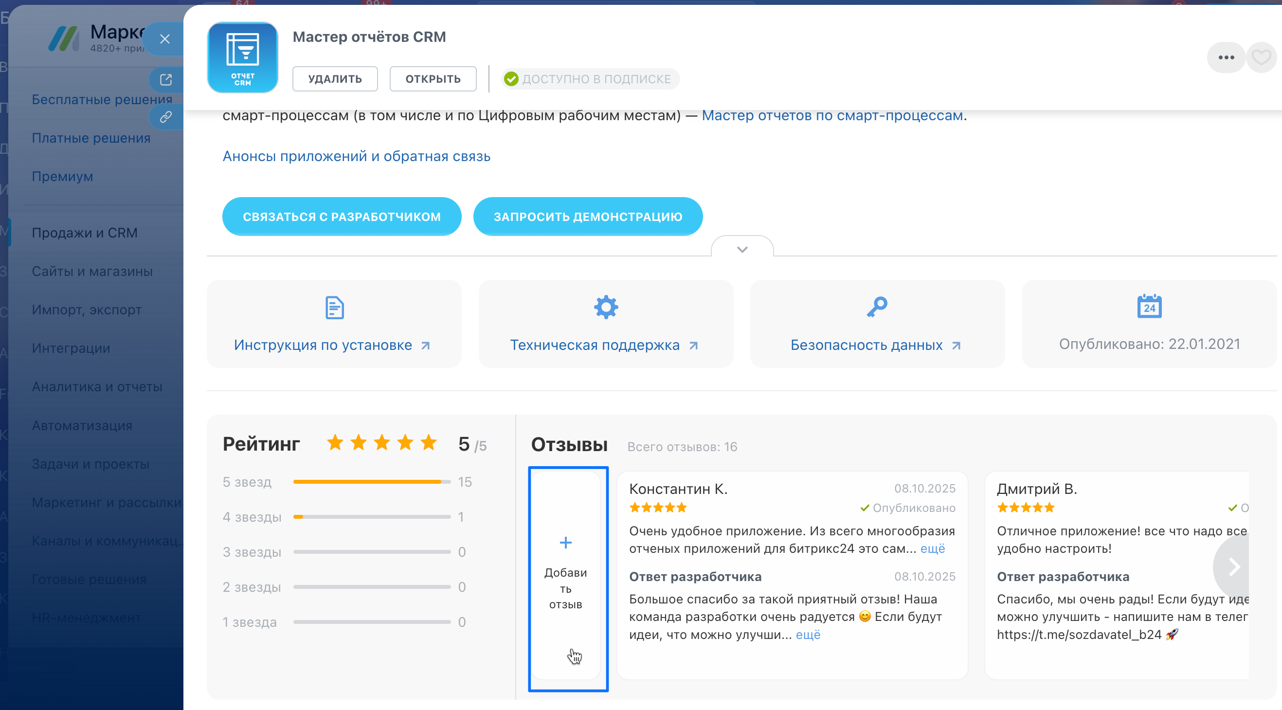 Найдите нужное приложение в каталоге и пролистайте его описание вниз. Нажмите кнопку «Добавить отзыв».